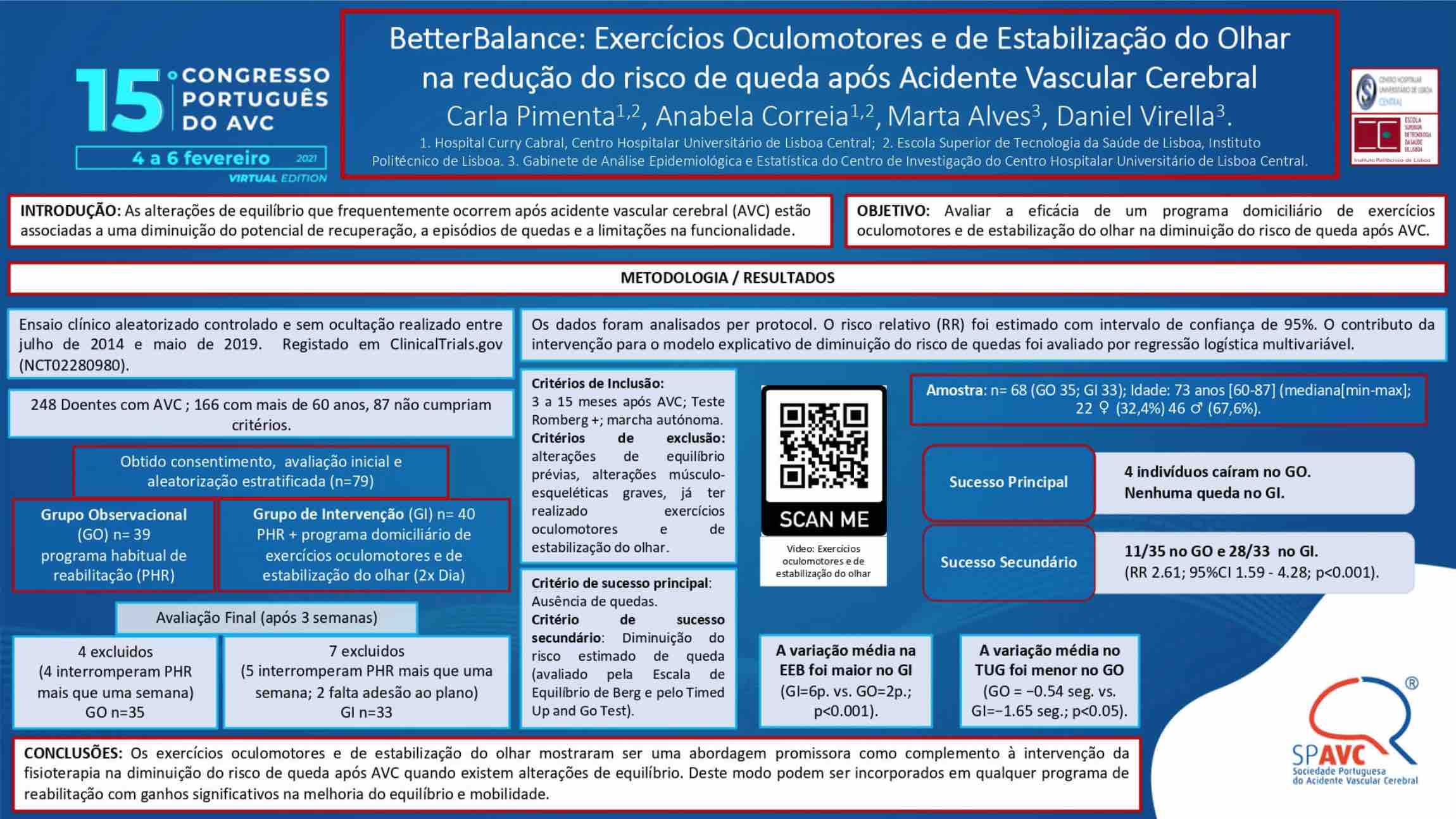 Pimenta C, Correia A, Alves M, Virella D. BetterBalance: exercícios oculomotores e de estabilização do olhar na redução do risco de queda após acidente vascular cerebral. In: 15º Congresso Português do AVC (online edition), 4-6 de fevereiro de 2021.