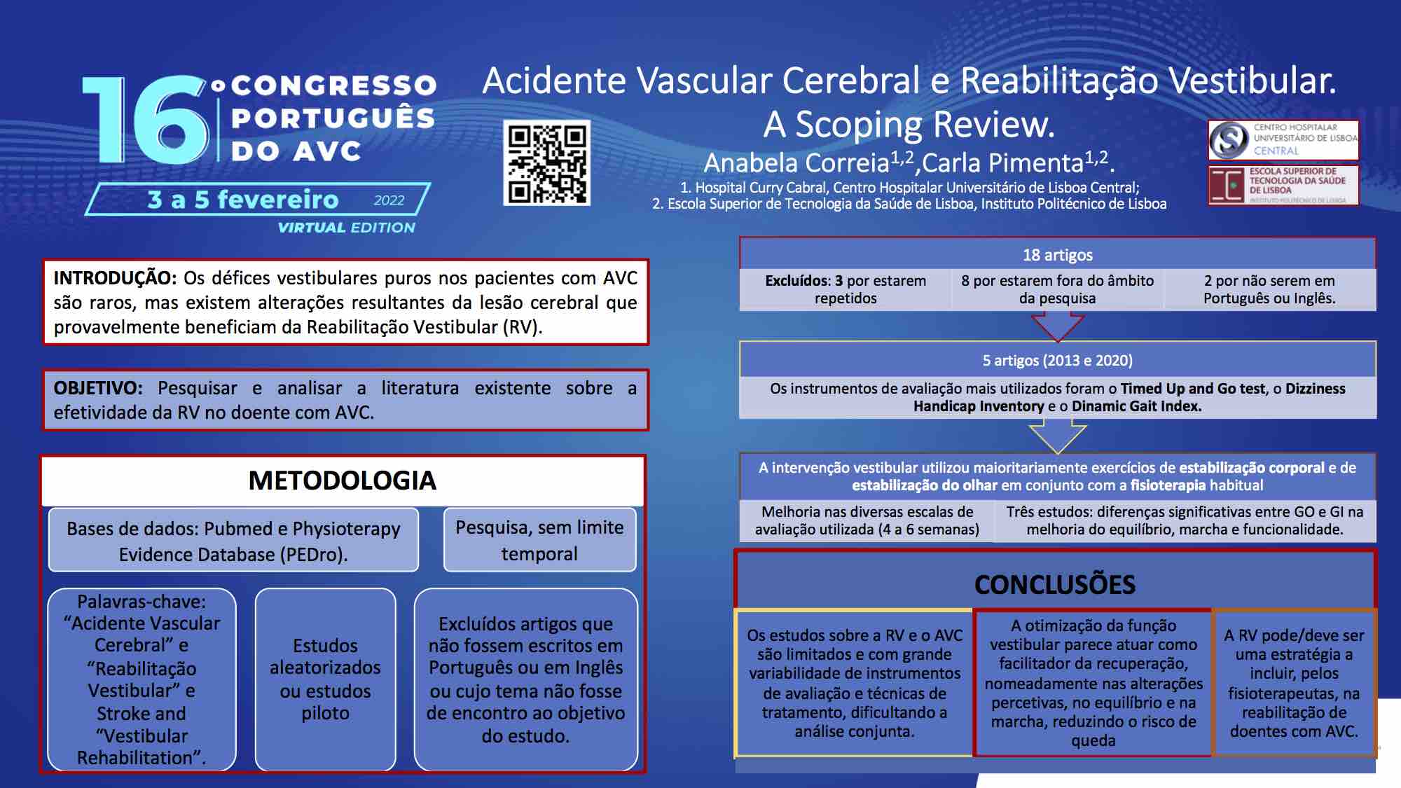 Correia A, Pimenta C. Acidente vascular cerebral e reabilitação vestibular: a scoping review. In: 16º Congresso Português do AVC [online], 3-5 de fevereiro de 2022.