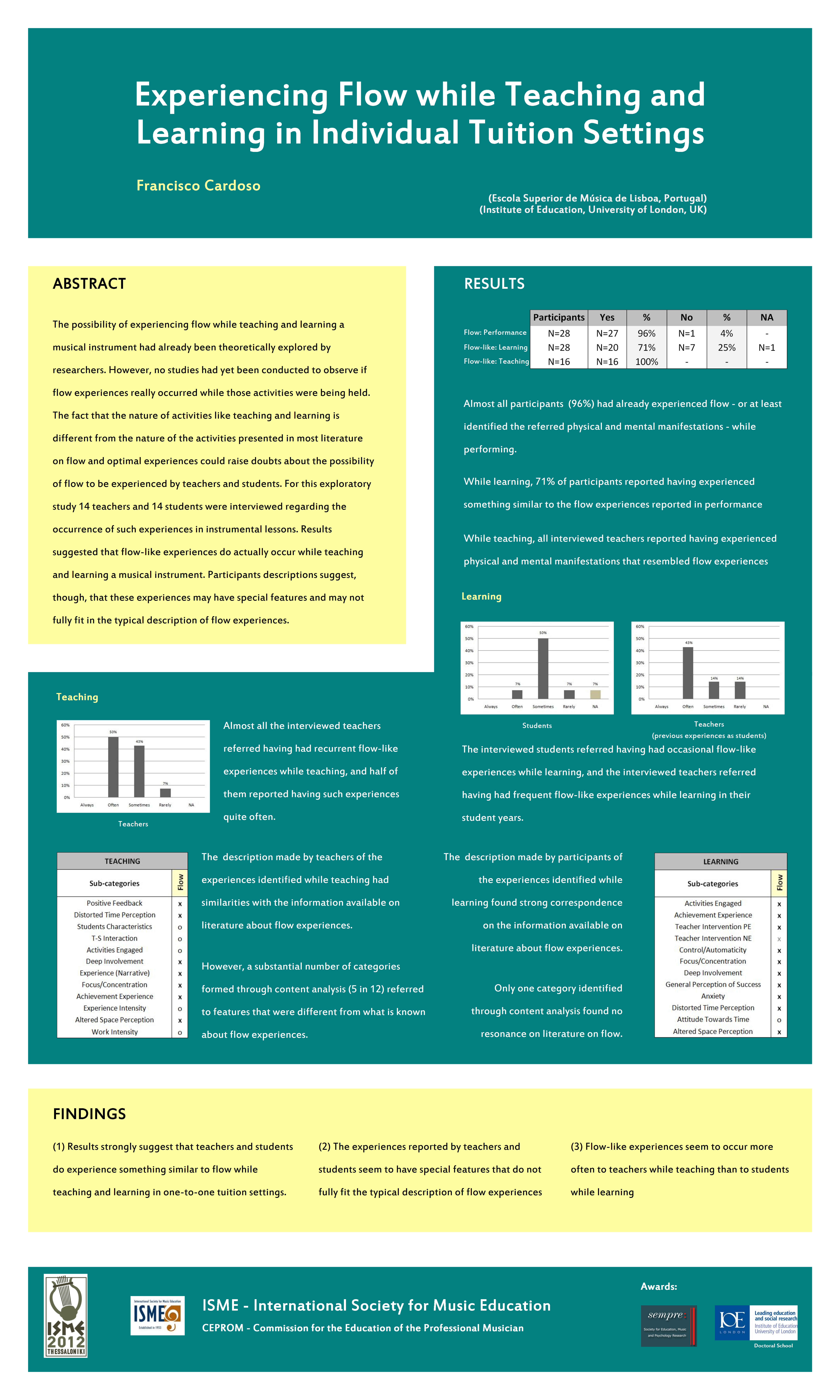 ABSTRACT: The possibility of flow to be experienced while teaching and learning a musical instrument had already been theoretically explored by researchers. However, no studies had yet been conducted to observe it flow experiences really occurred while those activities were being held. The nature of teaching and learning activities is different from the nature of the activities studied by researchers on flow and optimal experiences, which could might raise doubts about the possibility of flow to be experienced by teachers and students. For this exploratory study it were interviewed 14 teachers and 14 students regarding the occurrence of such experiences in instrumental lessons. Results suggest that flow-like experiences actually occur while teaching and learning. Participants descriptions suggest, though, that these experiences may have special features and may not fully fit in the typical description of flow experiences.