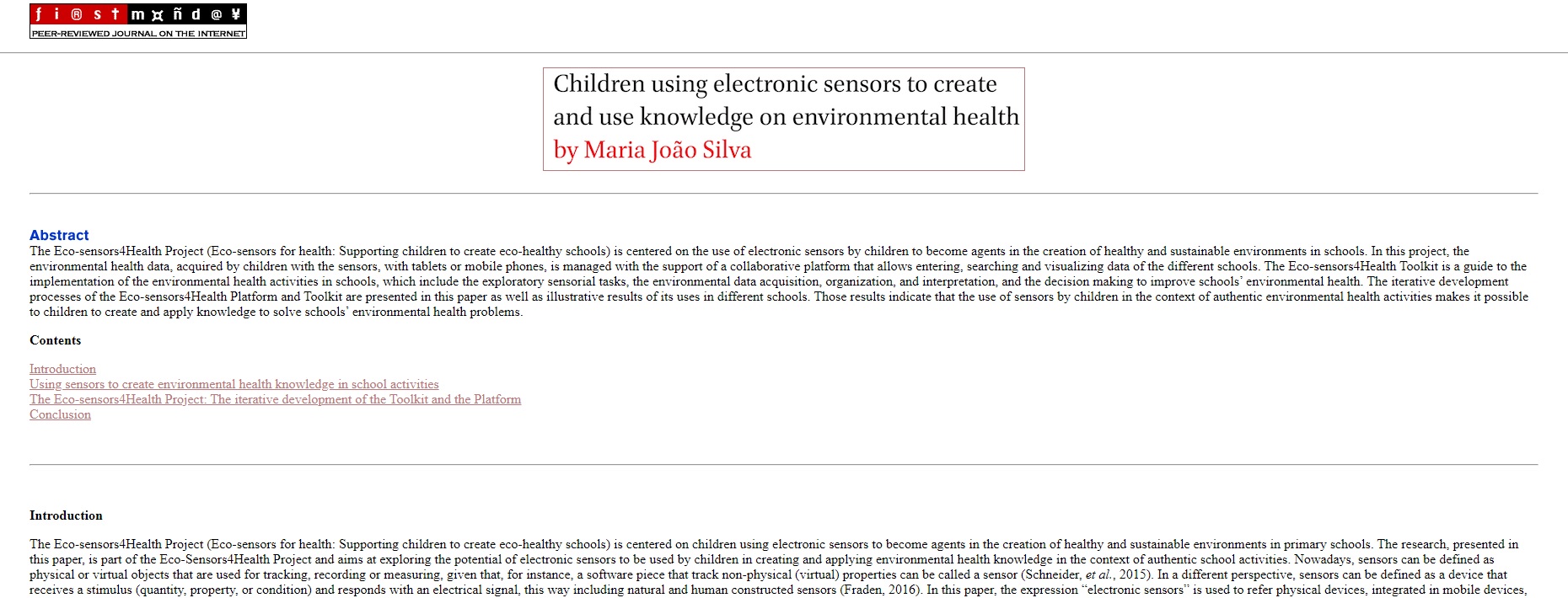 Silva, M. J. (2020). Children using electronic sensors to create and use knowledge on environmental health. First Monday, 25(3). https://doi.org/10.5210/fm.v25i3.9646