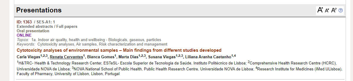 Viegas C, Cervantes R, Gomes B, Dias M, Viegas S, Caetano LA. Cytotoxicity analyses of environmental samples – Main findings from different studies developed. In: INDOOR AIR 2022 – The 17th International Conference on Indoor Air Quality and Climate, Kuopio (Finland), June 12-16, 2022.