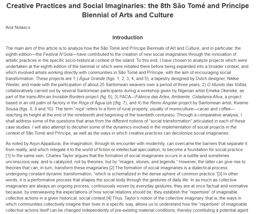 Nolasco, A. (2021). Creative Practices and Social Imaginaries: the 8th São Tomé and Príncipe Biennial of Arts and Culture, Field. A Journal .of Socially-Engaged Art Criticism, (University of California San Diego), 1–17. http://field-journal.com/issue-17/creative-practices-and-social-imaginaries-the-8th-sao-tome-and-principe-biennial-of-arts-and-culture