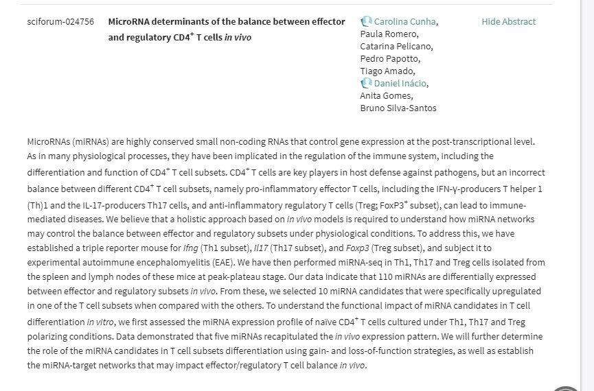 Cunha C, Romero PV, Pelicano C, Papotto P, Schmolka N, Gomes AQ, et al. MicroRNA determinants of the balance between effector and regulatory CD4+ T cells in vivo. In: RNA Regulatory Network, 3rd International Symposium on Frontiers in Molecular Science, Pavilhão do Conhecimento, Lisbon (Portugal), June 26-28, 2019.