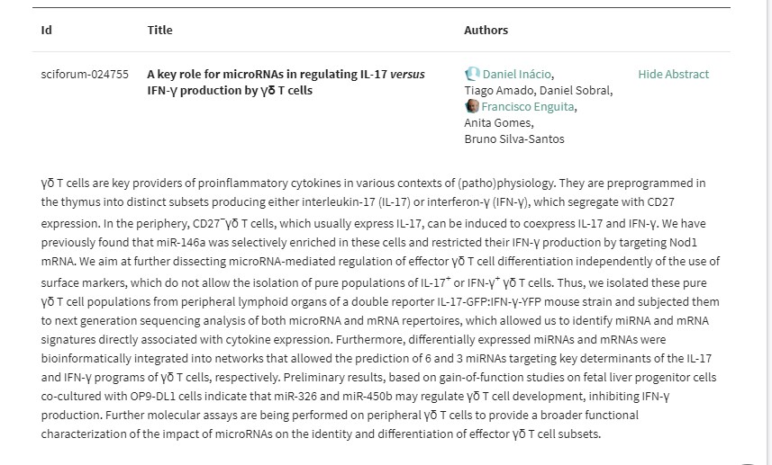 Inácio D, Amado T, Sobral D, Enguita F, Gomes AQ, Silva-Santos B. A key role for microRNAs in regulating IL-17 versus IFN-γ production by γδ T cells. In: RNA Regulatory Networks, 3rd International Symposium on Frontiers in Molecular Science, Pavilhão do Conhecimento, Lisbon (Portugal), June 26-28, 2019.